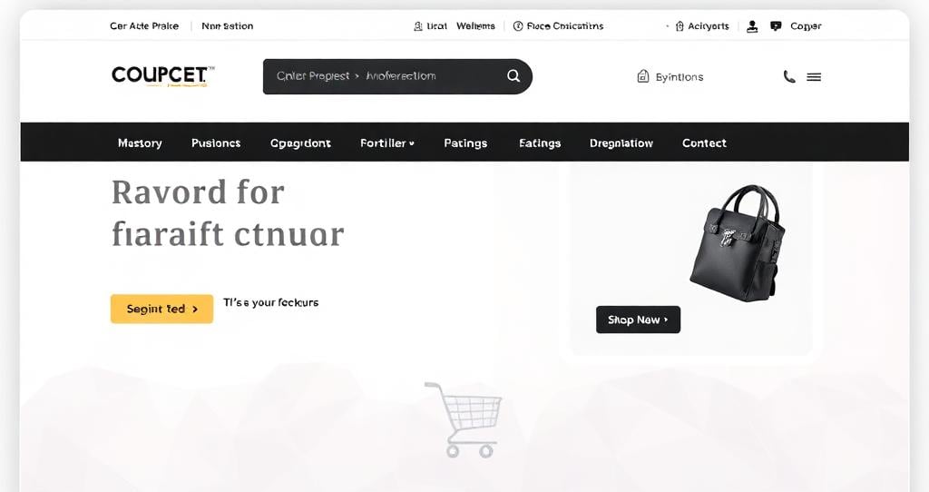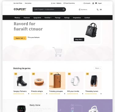 The eCommerce layout features a visually appealing header with an integrated search bar, facilitating effortless product discovery while showcasing promotional banners and the brand logo for instant recognition. Below, a dynamic product grid displays items with enticing images, prices, and essential details, allowing users to browse categories and quickly add products to their shopping cart. At the bottom, a streamlined footer includes links to customer service, return policies, and social media channels, enhancing user engagement and providing essential information for a satisfying shopping experience.